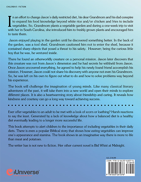 In an effort to change Jaxon’s daily restricted diet, his dear Grandmom and his dad conspire to expand his food knowledge beyond white rice and/or chicken and fries to include vegetables. So, Grandmom plants a vegetable garden and during a one-week trip to visit with her in South Carolina, she introduced him to freshly grown plants and encouraged him to taste them. Jaxon enjoyed playing in the garden until he discovered something better. In the back of the garden, was a tool shed. Grandmom cautioned him not to enter the shed, because it contained sharp objects that posed a threat to his safety. However; being the curious little boy that he was, he ventured inside. There he found an otherworldly creature on a personal mission. Jaxon later discovers that this creature was not from Jaxon’s dimension and he had secrets he withheld from Jaxon. Once Jaxon uncovered everything, he agreed to help his newly found friend accomplish his mission. However, Jaxon could not share his discovery with anyone not even his Grandmom. So, he was left on his own to figure out what to do and how to solve problems way beyond his experience. The book will challenge the imagination of young minds. Like many classical literary adventures of the past, it will take them into a new world and open their minds to explore different places. It is also a heartwarming story about friendship and caring. It reveals how kindness and courtesy can go a long way toward achieving success.